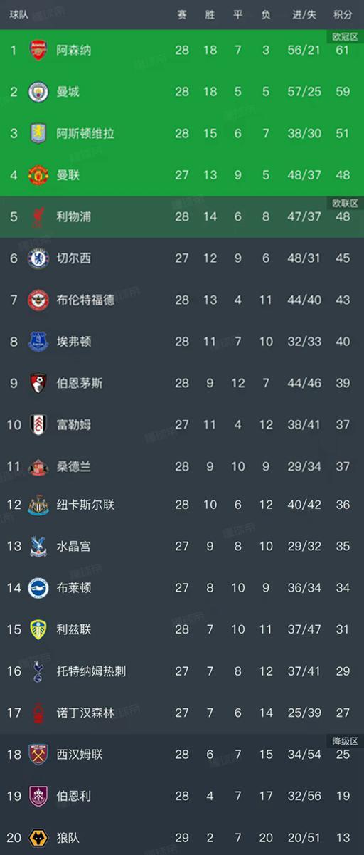 北京时间3月1日,随着曼城1-0小胜利兹联,利物浦5-2大胜西汉姆联,英超第28轮率先结束了6场比赛,我们看看最新积分榜变动!