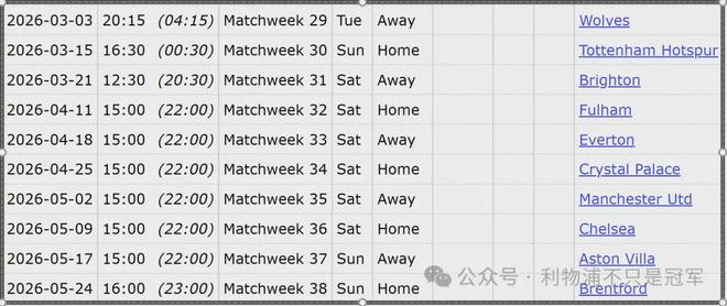 利物浦最后10轮当中,未来6场的难度相对小一点——客场vs狼队、主场vs热刺、客场vs布莱顿、主场vs富勒姆、客场vs埃弗顿不好打、主场vs水晶宫;随后三场难度较大——客场vs曼联、主场vs切尔西、客场vs维拉;联赛收官战是主场vs目前排名第7的布伦特福德。